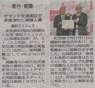 私は1948年、多度津の西の端見立の農家の3男として生まれ、19年間この地で育てられました。その後医師となり1991年より 34年間、港の西浜で小さな整形外科クリニックを開業しています。今回、ふるさとに巡回バスを寄贈出来ましたことは私にとって大変光栄なことであります。 思えば中学生時代に新しくできた白方トンネルの山頂付近で父親とブドウ畑を開墾している時、遠くに津島神社を眺めながら 「人間は周りの人々によって生かされている。ゆえに人生でどんなことがあろうとも感謝する事を決して忘れてはいけない。」と教えられました。その後、私の人生の座右の銘は、「感謝」一筋であります。 今回、いただいた感謝状を、亡き父はあの世で大変喜んでいると思います。 最後に善紀クリニックの職員一同を代表して多度津町に心よりお礼申し上げます。 感謝状 ありがとうございます。 |